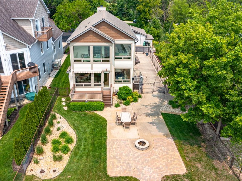 Prime resort style living on a premium lot with 73 ft of waterfront on the Fox Lake! Endless panoramic water views from every room in this custom built home filled with lots of architectural detail and craftmanship ~ Open floorplan featuring a chef lover’s dream kitchen with 42″ maple cabinets, quartz countertops, breakfast bar, built in cooktop, tile backsplash, double pantries ~ Architectural beams enhance the formal dining room with built-in hutch and great room with fireplace including wall of windows to bring in lots of natural light and stunning water views of the lake ~ Double French glass doors lead to the main floor office ~ Breathtaking luxury master suite with tremendous water views with sitting room that faces the lake to enjoy sunsets / deluxe bathroom with a stand alone tub, travertine floors, copper vellum sinks, shower with glass surround, huge walk-in closet ~ Second floor family room (currently used as a bunk room) with vaulted ceilings / ventless fireplace ~ Generous sized secondary bedrooms ~ Main floor laundry room with sink & cabinets ~ Full filtration water system with softener thru-out the house and a flow through foundation ~Attached two car garage with 10 ft ceilings / high bay ~ Separate 3+ car garage with 10 ft door to store your cars, motorhome, boat, toys, etc ~ Stone patio to enjoy not only the mature landscaping but the water views (Great for entertaining) ~ 48 ft pier with an additional 8 ft section with ladders for jet skis ~ Waterfront living at its FINEST!!!